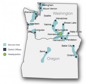 - Pusat - Area Sunnyside, Wenatchee / Moses Lake, Tri-Cities, Walla Walla dan Yakima.